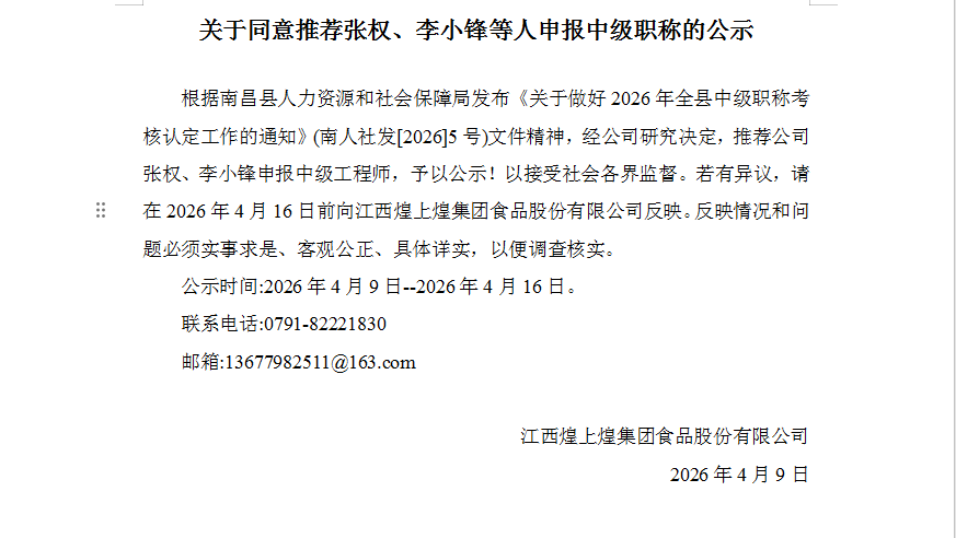 根據(jù)南昌縣人力資源和社會保障局發(fā)布《關(guān)于做好2026年全縣中級職稱考核認(rèn)定工作的通知》(南人社發(fā)[2026]5號)文件精神,經(jīng)公司研究決定,推...