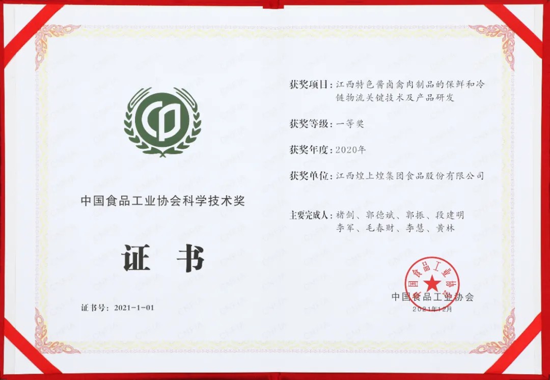 12月17-18日,以“科技·洞見未來”為主題的2021中國食品工業科技進步大會在鄭州召開,會上頒發了“中國食品工業協會科學技術獎”。煌上煌承擔的科研項目“江西特色醬鹵禽肉制品的保鮮和冷鏈物流關鍵技術及其產品研發”獲得了中國食品工業協會科學技術獎一等獎,煌上煌股份公司副董事長褚劍被授予“全國食品工業科技創新領軍人物”榮譽稱號。