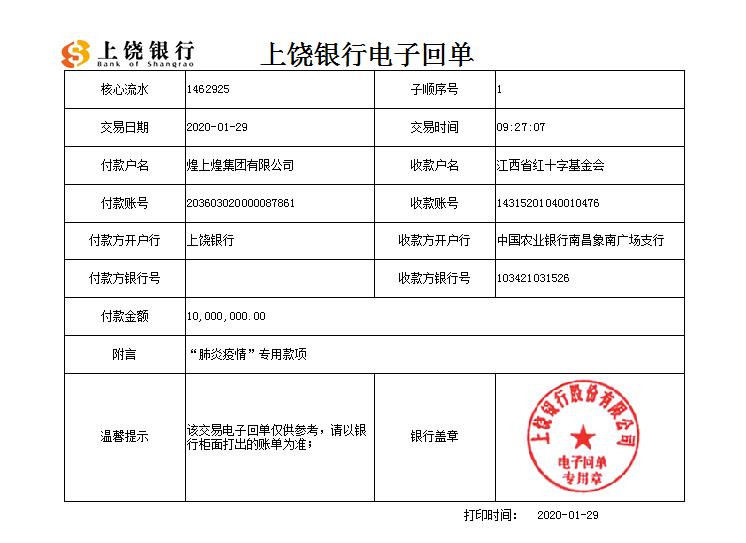 這個春節,席卷而來的新型冠狀病毒肺炎疫情牽動著全國人民的心。越是困難時期,企業越要承擔社會責任。自疫情爆發以來,煌上煌集團在做好自身防疫措施的同時,緊急啟動抗擊疫情愛心捐款行動。1月29日,在集團董事局主席徐桂芬、集團黨委書記兼總裁褚建庚、股份公司董事長兼總經理褚浚的部署安排下,公司決定通過江西省紅十字基金會捐款人民幣1000萬元現金,全力支持抗擊新型冠狀病毒感染的肺炎疫情防控工作。