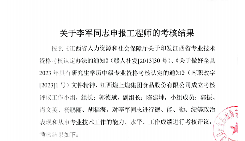 關于李軍同志申報工程師的考核結果公示依據《江西省人力資源和社會保障廳關于印發江西省專業技術資格考核認定辦法的通知》(贛人社發[2013]...