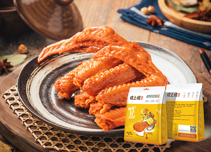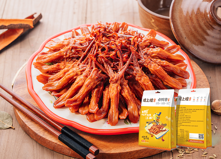 精選規格一致的新鮮鴨脖,摘凈淋巴組織,采用多種調味料腌漬,經真...